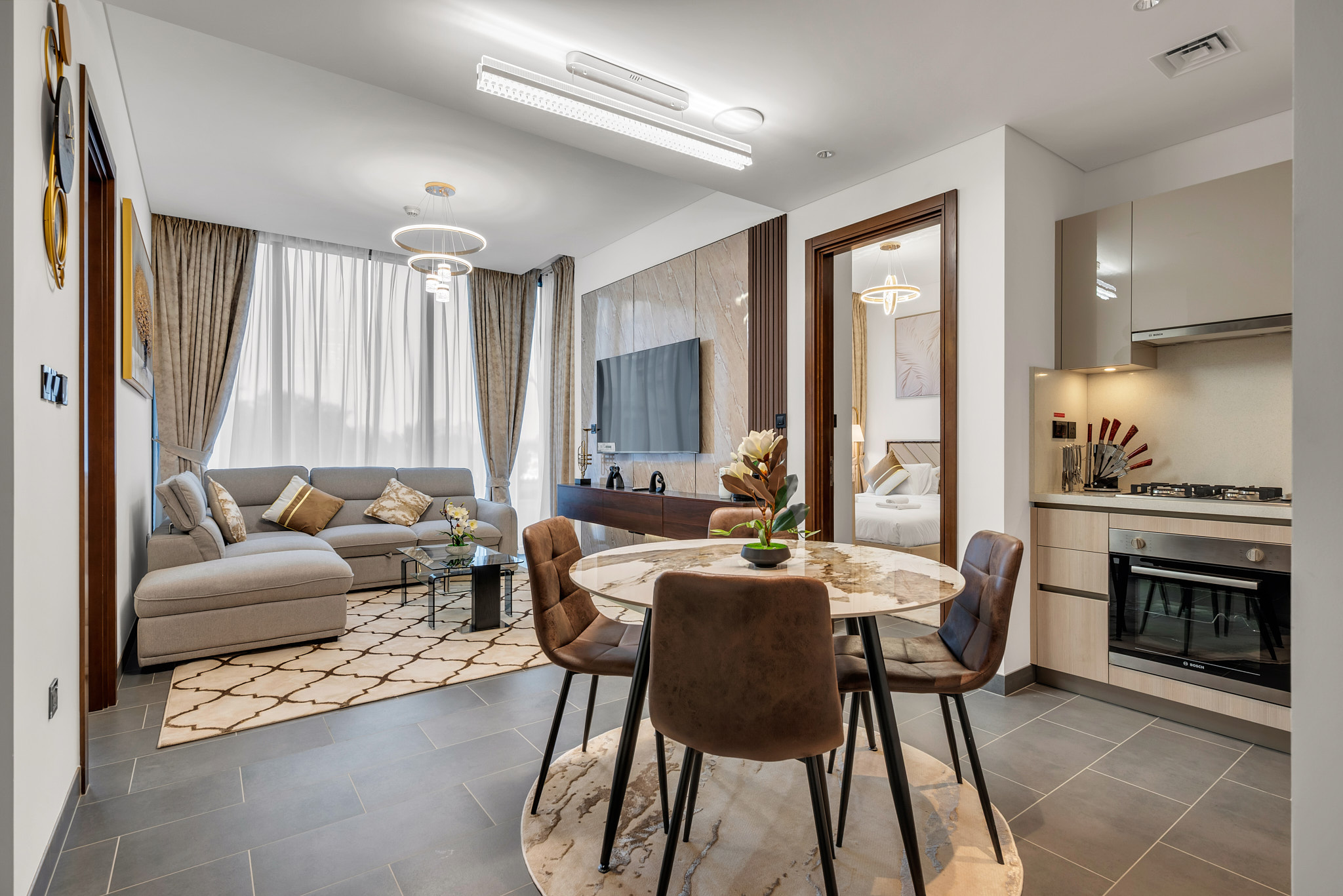 The living area features a bright open layout with a six seater sofa bed, smart TV, center table, TV console, carpet, curtains and selected décor accents. The dining corner includes a dining table with four chairs. The kitchen is fully equipped with cookware, utensils, cutlery, plates, bowls, glasses, mugs, electric kettle, toaster, microwave, refrigerator, cooking tools, cutting board, kitchen towels and a starter cleaning kit.