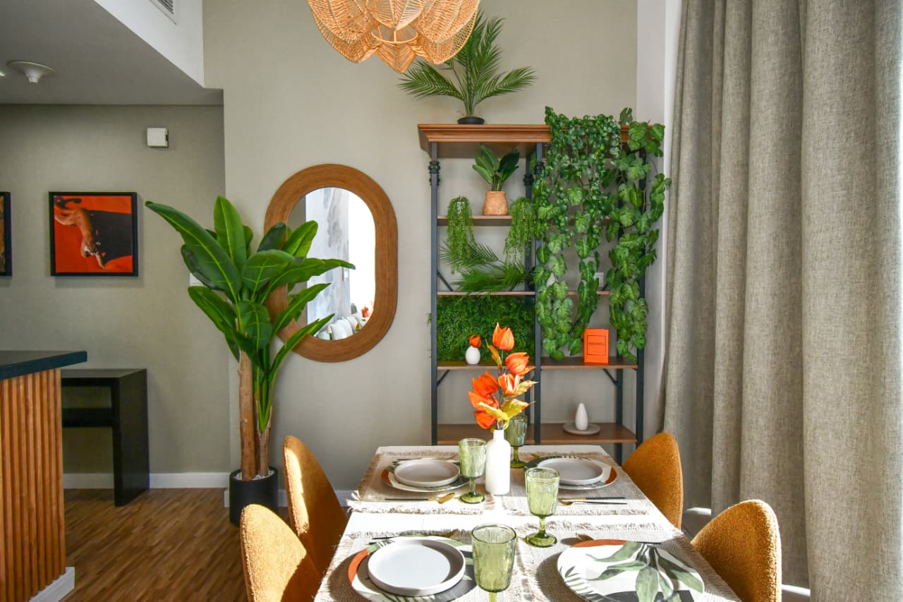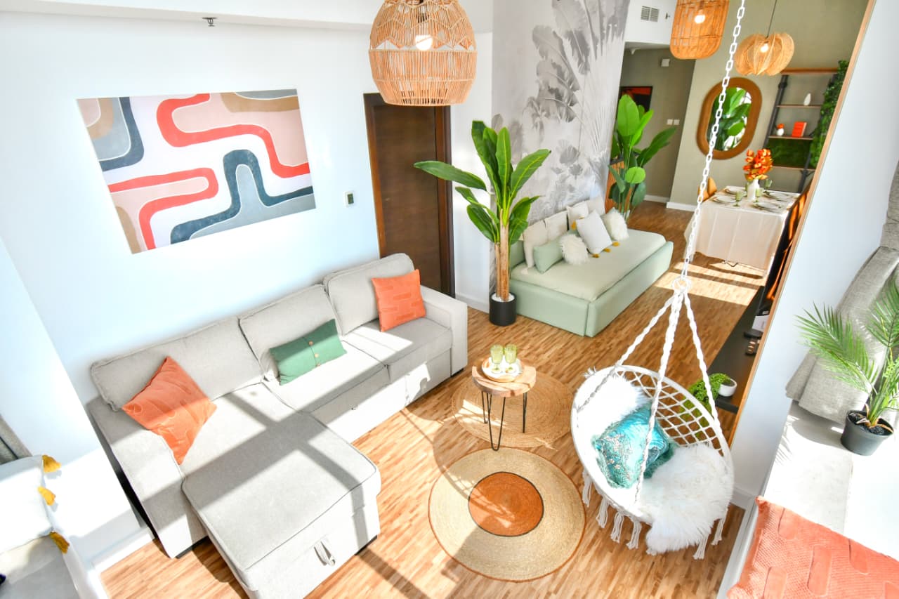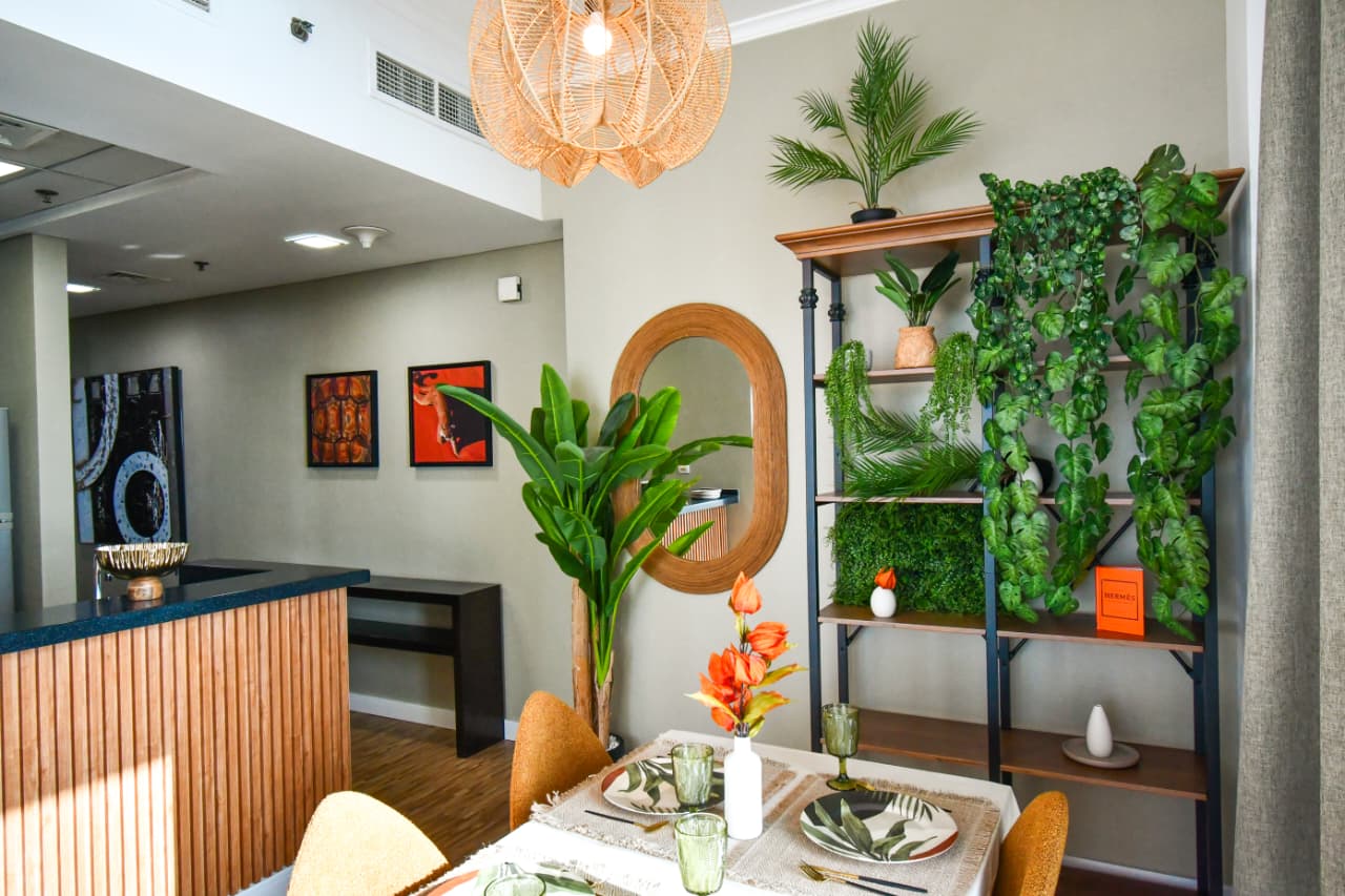 The living area features an open plan layout with a comfortable sofa, smart TV, TV console, center table, carpet, curtains and selected décor pieces. The dining area includes a dining table with two chairs positioned next to the window to enjoy the view.